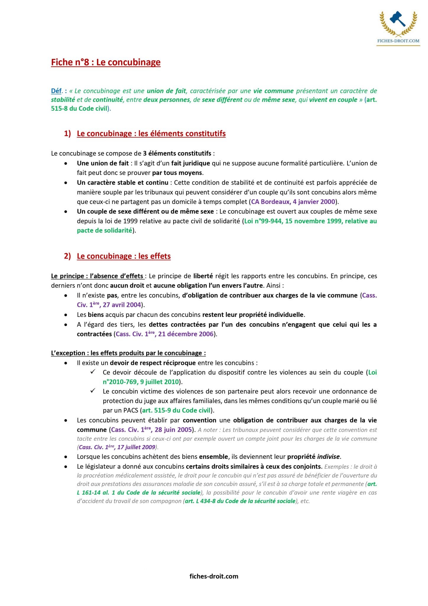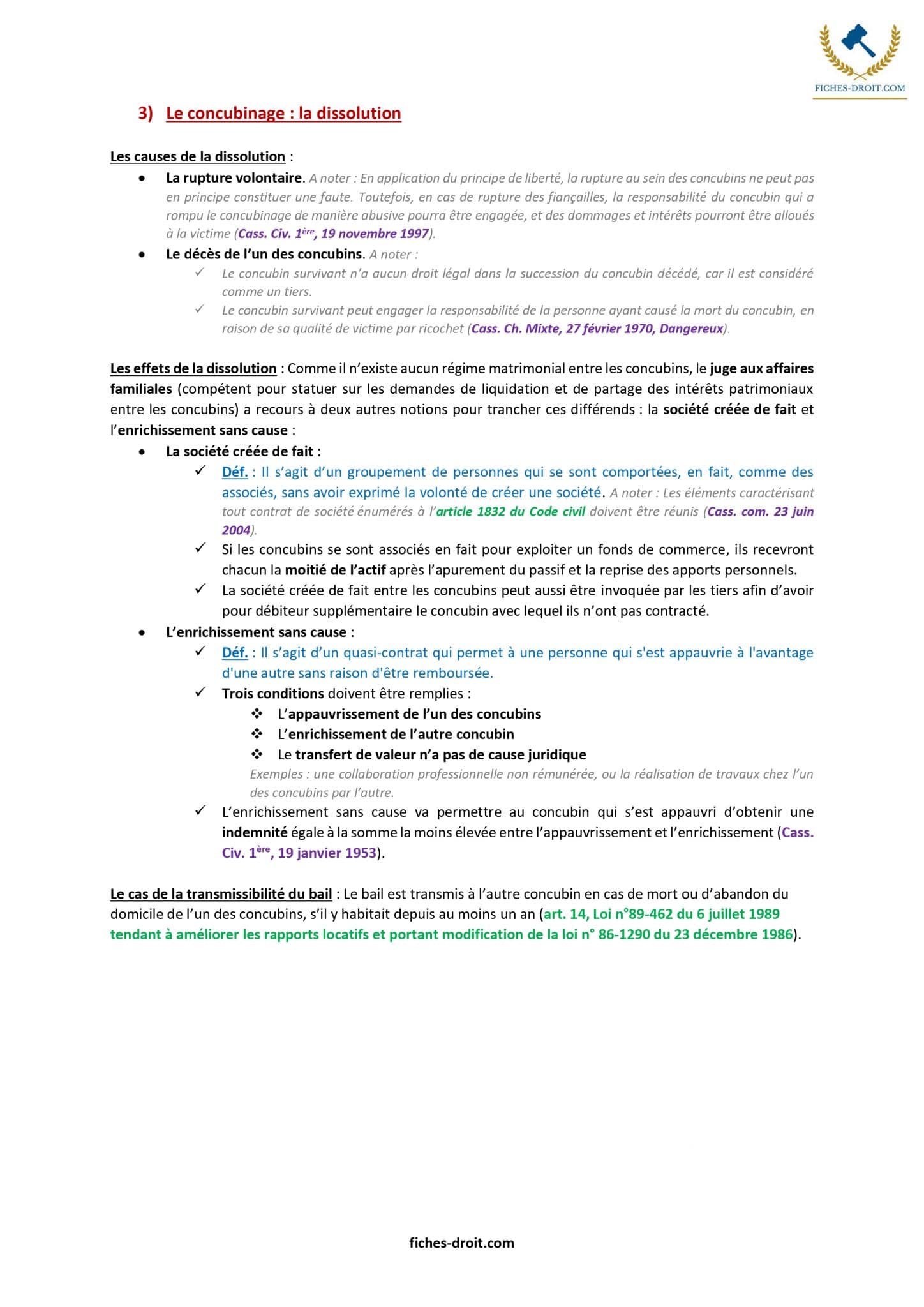 Les Fiches de droit de la famille sont :